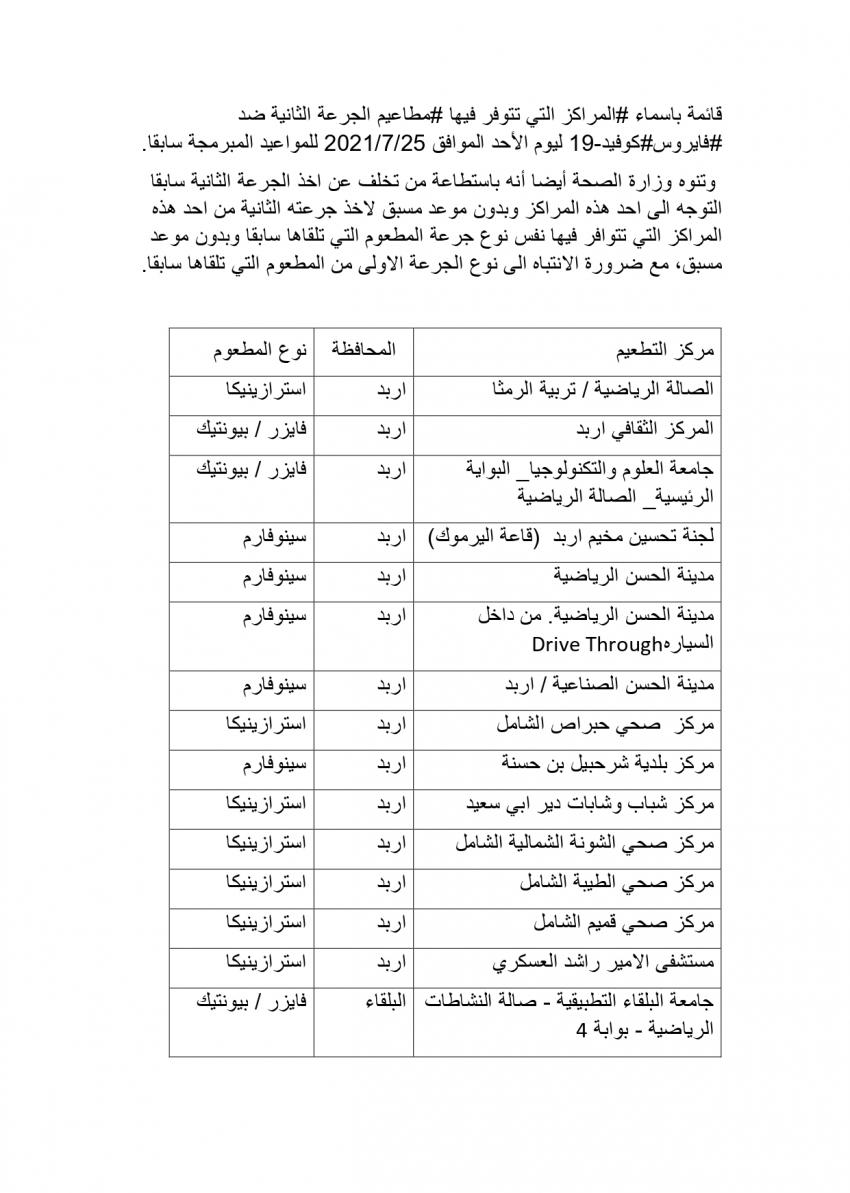 وتنوه وزارة الصحة أيضا أنه باستطاعة من تخلف عن اخذ الجرعة الثانية سابقا التوجه الى احد هذه المراكز وبدون موعد مسبق لاخذ جرعته الثانية من احد هذه المراكز التي تتوافر فيها نفس نوع جرعة المطعوم التي تلقاها سابقا وبدون موعد مسبق، مع ضرورة الانتباه الى نوع الجرعة الاولى من المطعوم التي تلقاها سابقا.