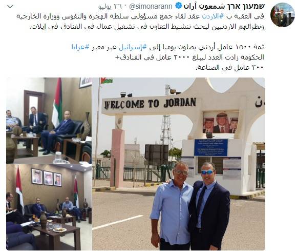 وتابع اران قوله ان ثمة ١٥٠٠ عامل أردني يصلون يوميا إلى إيلات المحتلة عبر العقبة والحكومة الاسرائيلية زادت العدد ليبلغ ٢٠٠٠ عامل في الفنادق مضاف اليهم 300 عامل في الصناعة.