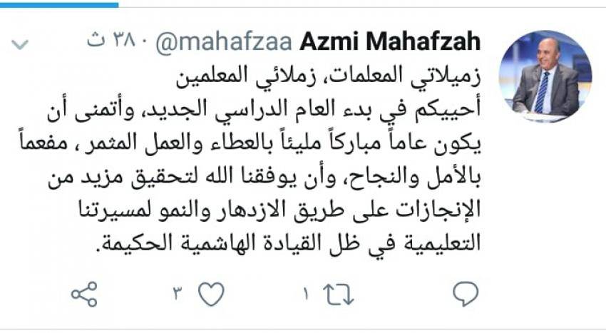 أحييكم في بدء العام الدراسي الجديد، وأتمنى أن يكون عاماً مباركاً مليئاً بالعطاء والعمل المثمر ، مفعماً بالأمل والنجاح، وأن يوفقنا الله لتحقيق مزيد من الإنجازات على طريق الازدهار والنمو لمسيرتنا التعليمية في ظل القيادة الهاشمية الحكيمة'.
