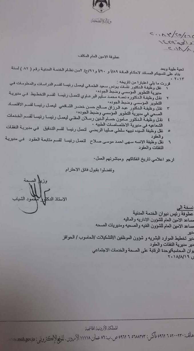 كما قرر الوزير، نقل الدكتور مأمون حسام الدين رسلان المفتي ليعمل رئيساً لقسم الخدمات الشعاعية في مديرية الإختصاصات الطبية، ونقل السيدة نبيهة سلطي صليبا الربضي لتعمل رئيساً لقسم التدقيقي في مديرية النفقات والعقود، ونقل الآنسة سهى أحمد موسىة صلاح لتعمل رئيسةً لقسم متابعة العقود في مديرية النفقات والعقود.