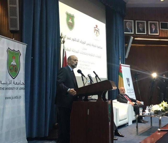 أكد رئيس الوزراء الدكتور عمر الرزاز هذه الحكومة واجهت مجموعة من التحديات وان الحكومة جاءت على اثر الاحتجاجات الشعبية، وبعدها بايام رأينا ازمة اللاجئين السوريين على الحدود وتلى ذلك العمل الجبان الارهابي في الفيحص والسلط، ثم بروز عدد من الاجراءات الاحادية على مستوى العالمي التي من شأنها تصفية القضية الفلسطينية.