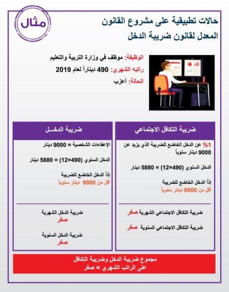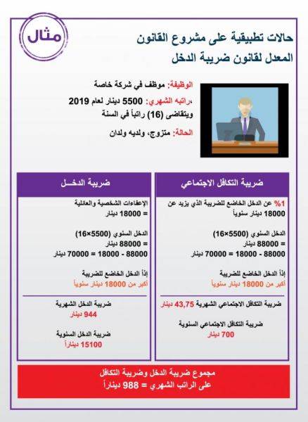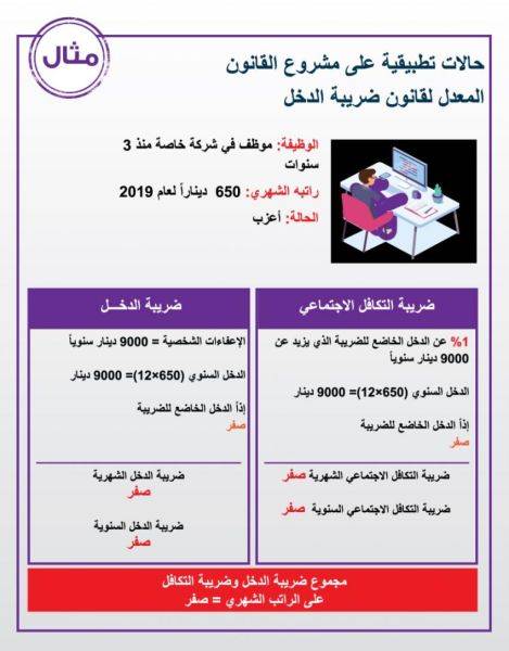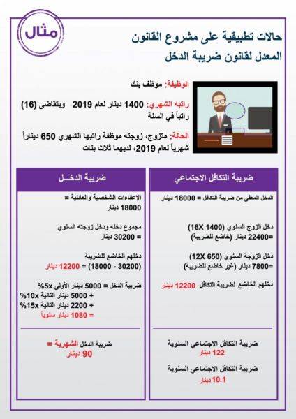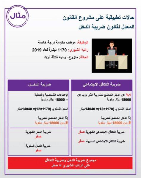 توضح الصور المرفقة أمثلة على الحالات التي يكون فيها المواطن خاضع لضريبة الدخل نسبة للدخل الشهري بحسب مشروع القانون الجديد. وفي الصور حالات تطبيقية على مشروع القانون المعدل لقانون ضريبة الدخل حول إعفاءات الأفراد والأسر، على النحو التالي: