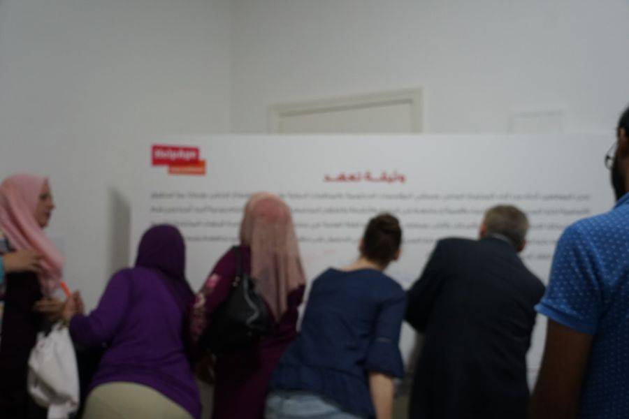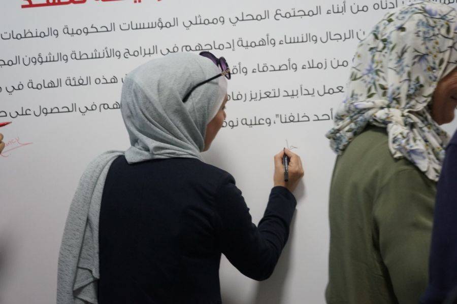 وشارك في توقيع الوثيقة ما يقارب الـــ 100 شخصا من مؤسسات المجتمع المدني والقطاع الحكومي والخاص والفئات الشبابية بالإضافة إلى المجتمع المحلي.