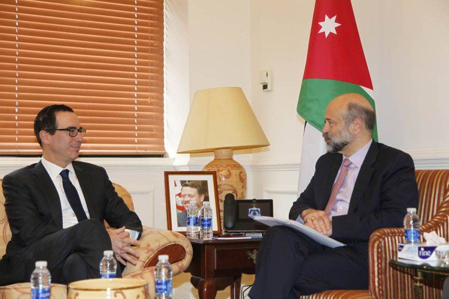 ولفت الرزاز الى اهمية اتفاقية التجارة الحرة بين الاردن والولايات المتحدة التي توفر فرصا كبيرة للصادرات الاردنية في قطاع الالبسة ونامل فتح مجالات اوسع التصدير لسلع اخرى. من جهته، أكد وزير الخزانة الأميركي ان زيارته الحالية للمملكة تأتي للتأكيد على العلاقات الوثيقة التي تجمع الولايات المتحدة الامريكية مع الاردن، لافتا إلى أن الولايات المتحدة مستمرة بدعم الأردن في مختلف المجالات. ولفت الى أهمية الدور الذي يقوم به الأردن كعنصر من عناصر الأمن والاستقرار في المنطقة، وتقدير بلاده لحجم الاعباء التي يتحملها الاردن في استضافة اللاجئين السوريين.