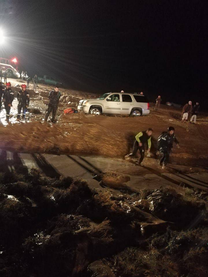 دفعت قوات الدرك بتعزيزات من القوى البشرية وآليات الدفع الرباعي، منذ فجر اليوم إلى منطقة الوالة ومليح في محافظة مأدبا لمساندة جهود البحث والإنقاذ، حيث لا تزال الجهود مستمرة في المنطقة.