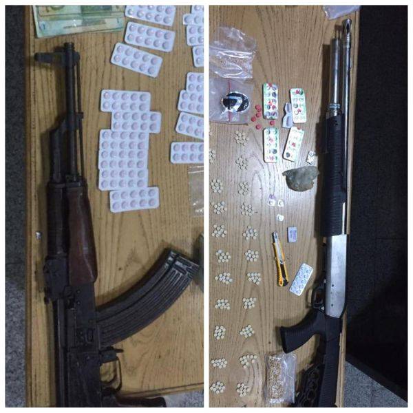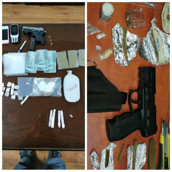 وفي محافظة البلقاء / عين الباشا دوهم منزل احد مروجي المواد المخدرة من جنسية عربية وجرى ضبطه وبحوزته سلاح ناري وكف من مادة الحشيش المخدر ومجموعة قطع من ذات المادة معدة للبيع ، كما والقي القبض في محافظة العقبة على احد الاشخاص المشبوهين بقضايا المخدرات وضبط بحوزته سلاح ناري.