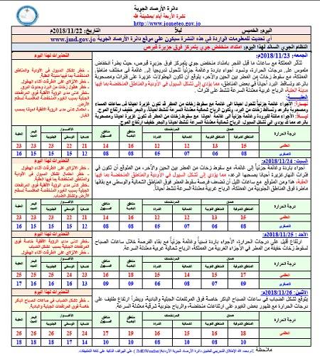 تتأثر المملكة اليوم منذ ساعات الفجر بامتداد منخفض جوي يتمركز جنوب جزيرة قبرص، حيث يطرأ انخفاض ملموس على درجات الحرارة، حيث تسود أجواء باردة نسبيا وغائمة جزئيا تتحول تدريجي ا إلى غائمة في مختلف مناطق المملكة، مع سقوط زخات من المطر بين الحين والآخر، يتوقع أن تكون الهطولات غزيرة على فترات، يصحبها الرعد وتساقط زخات من البرد أحيانا في بعض المناطق، مما يؤدي إلى تشكل السيول في الأودية والمناطق المنخفضة بما فيها العقبة، الرياح غربية معتدلة إلى نشطة السرعة.