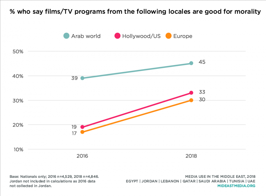 ازدادت نسبة المواطنين العرب – على الأرجح - الذين يرون أن محتوى الأفلام والتلفاز الأمريكي والأوربي يقدم مادة أخلاقية جيدة مقارنة بعام 2014. فيما تقل بشكل كبير نسبة المواطنين الذين يرون أن الأفلام والتلفاز العربي يقدم مادة أخلاقية جيدة.