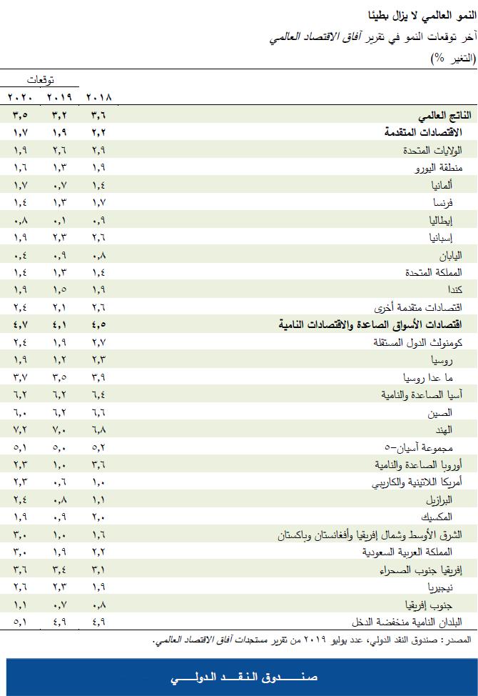 ويتسم النمو العالمي بالبطء والمخاطر المحيطة، لكنه لا يجب أن يكون كذلك بالضرورة، لأن جانبا من هذه السمات يرجع لأسباب ذاتية. فديناميكية الاقتصاد العالمي تتأثر بامتداد فترة عدم التيقن من اتجاه السياسات مع التوترات التجارية التي لا تزال محتدمة رغم الهدنة التجارية بين الولايات المتحدة والصين مؤخرا، وتوترات التكنولوجيا التي تفجرت مؤخرا لتشكل خطرا على سلاسل توريد التكنولوجيا العالمية، وزيادة احتمالات خروج بريطانيا من الاتحاد الأوروبي دون اتفاق