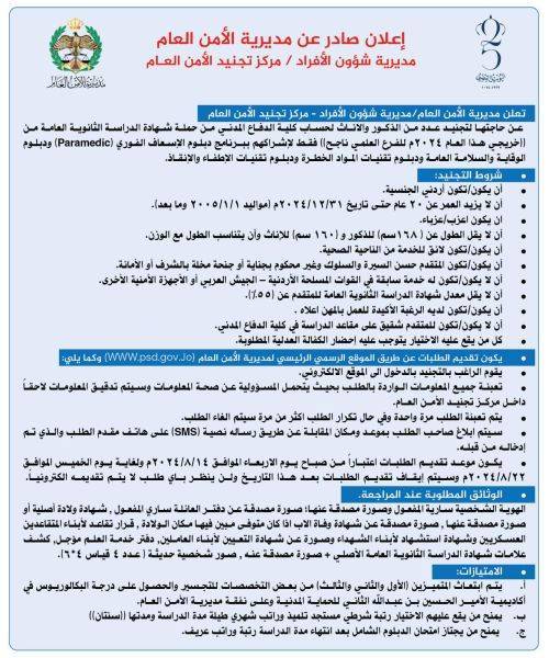 أعلنت مديرية الأمن العام / مديرية شؤون الأفراد – مركز تجنيد الأمن العام، اليوم الثلاثاء، فتح باب التجنيد لحملة التوجيهي.