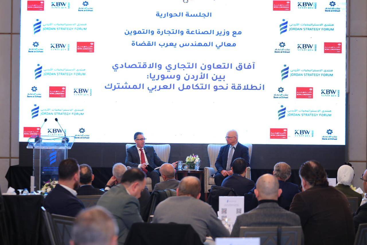 كان ذلك خلال جلسة حوارية استضافها منتدى الاستراتيجيات الأردني بعنوان "آفاق التعاون التجاري والاقتصادي بين الأردن وسوريا: انطلاقة نحو التكامل العربي المشترك" وبمشاركة الأمين العام لوزارة الصناعة والتجارة والتموين المهندسة دانا الزعبي، وحضور أعضاء المنتدى، وممثليغرف الصناعة والتجارة. وقد كانت الفعالية برعاية شركة الملكية الأردنية، وشركة كيه بي دبليو فنتشرز، وبنك الاتحاد.