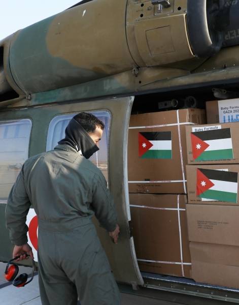 وقال، إنه بتوجيهات ملكية سيجري اليوم تسيير 16 طائرة عمودية تحمل مواد إغاثية وغذائية وطبية إلى أشقائنا في غزة ستستمر على مدى 8 أيام عمل.
