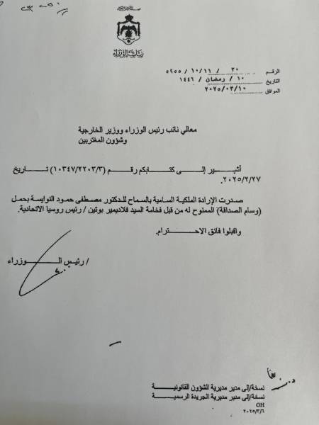 صدرت الإرادة الملكية الساميّة بالسماح للدكتور المحامي مصطفى حمود النوايسه بحمل وسام الصداقة الممنوح له من قبل فخامة الرئيس فلاديمير بوتين رئيس الاتحاد الروسي.