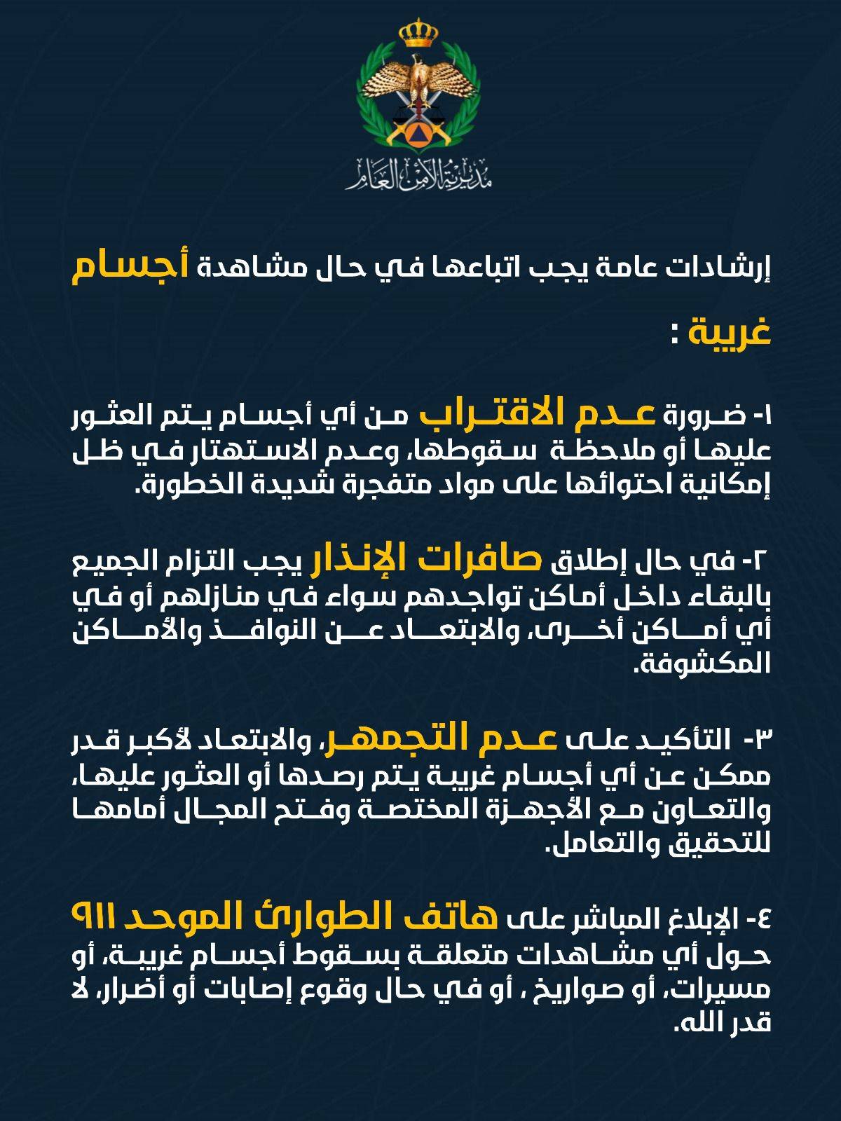 1- ضرورة عدم الاقتراب من أي أجسام يتم العثور عليها أو ملاحظة سقوطها، وعدم الاستهتار في ظل إمكانية احتوائها على مواد متفجرة شديدة الخطورة.