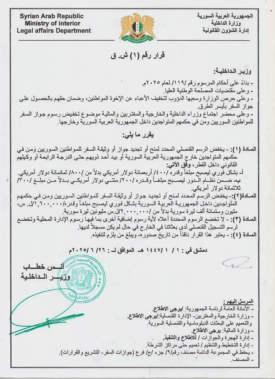 وزير الداخليه السوري يقرر تخفيض رسوم جوازات السفر