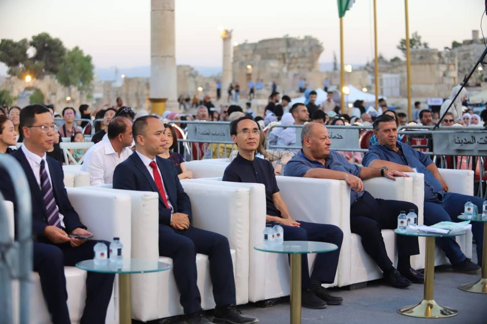 وبدأت الليلة بعزف النشيد الوطني الصيني ترحبيا بالقائم بأعمال السفارة الصينية قونغ آن مين في الأردن و بالضيوف من الجالية الصينية في الأردن وكان في استقبالهم رئيس بلدية جرش أحمد هاشم العتوم والمدير التنفيذي لمهرجان جرش أيمن سماوي، وتلاه النشيد الوطني الأردني.