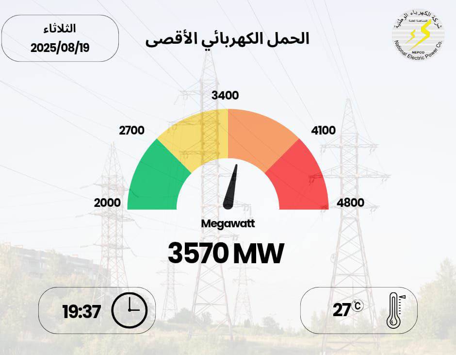 الأنباط - بلغ أقصى حمل كهربائي مسجل، اليوم الثلاثاء، 3570 ميجا واط، بحسب بيانات شركة الكهرباء الوطنية.