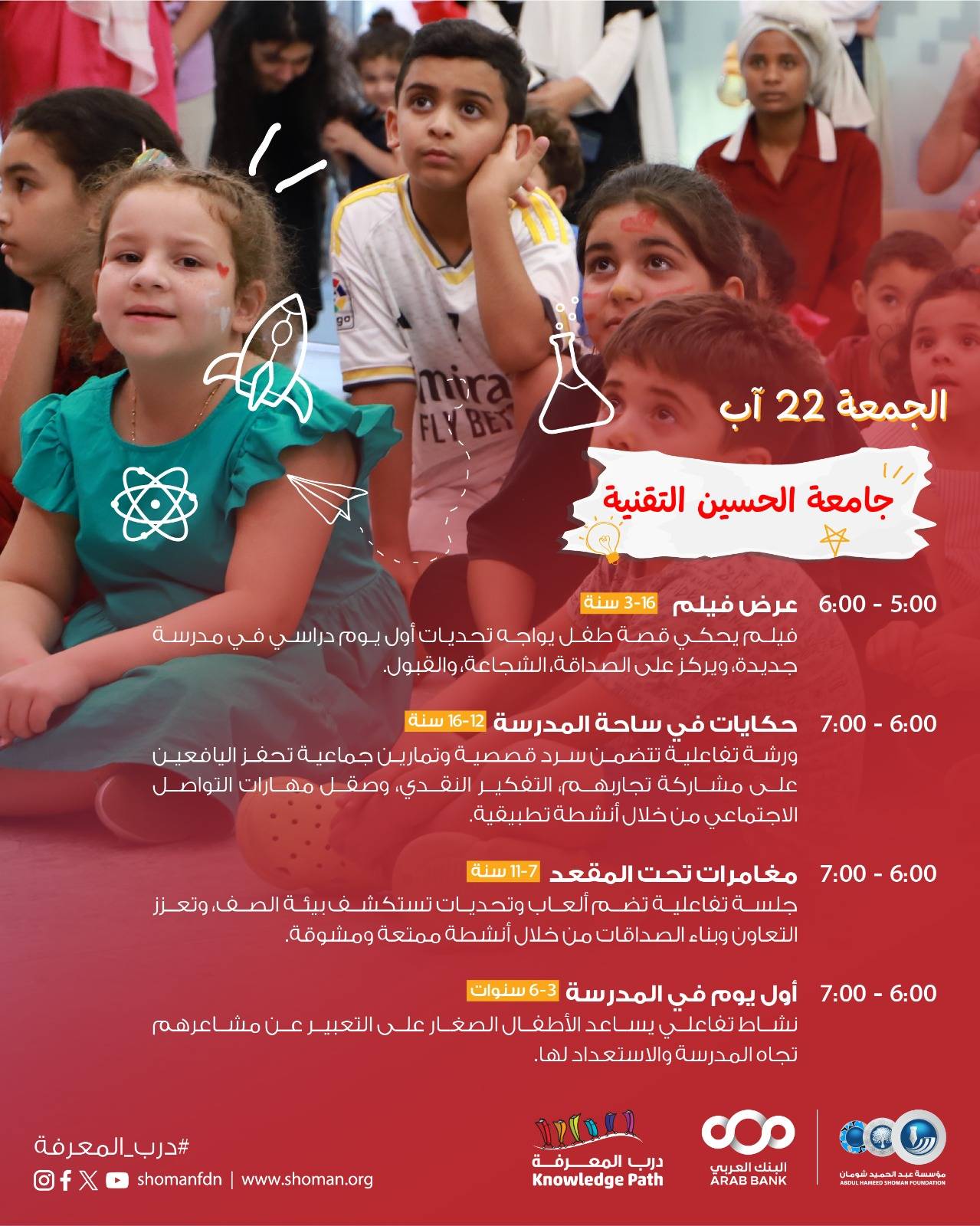 عن مشاعرهم تجاه المدرسة واستعدادهم لها، والأطفال من 7-11 سنة، من خلال جلسة "مغامرات تحت المقعد" التي تضم ألعابا وأنشطة تعزز التعاون وبناء الصداقات في بيئة صفية مشوقة، إضافة إلى اليافعين من 12-16 سنة، عبر ورشة "حكايات في ساحة المدرسة"، التي تتضمن السرد قصصي والتمارين الجماعية التي تحفز على التفكير النقدي ومهارات التواصل، كذلك الفئة العمرية 7-16 سنة من خلال أنشطة "سينما الأطفال واليافعين" التي تعرض أفلاما قصيرة تجسد تحديات أول يوم دراسي جديد، وتشجع على قيم الشجاعة والصداقة والقبول.