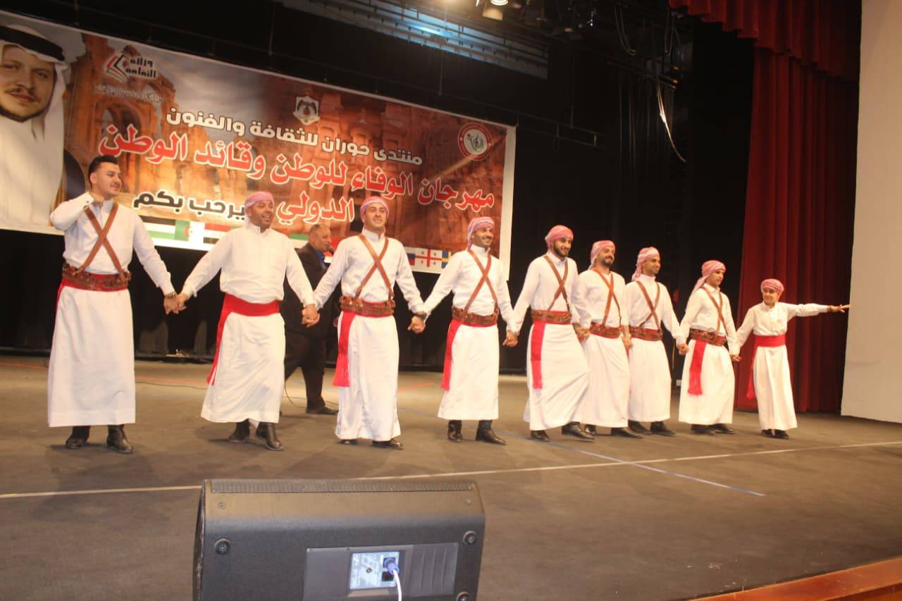 رعى رئيس الديوان الملكي الهاشمي يوسف حسن العيسوي، اليوم في مدينة إربد، انطلاق فعاليات مهرجان الوفاء للوطن وقائد الوطن الدولي العاشر، الذي ينظمه منتدى حوران للثقافة والفنون بمشاركة عدد من الفرق العربية والأجنبية.
