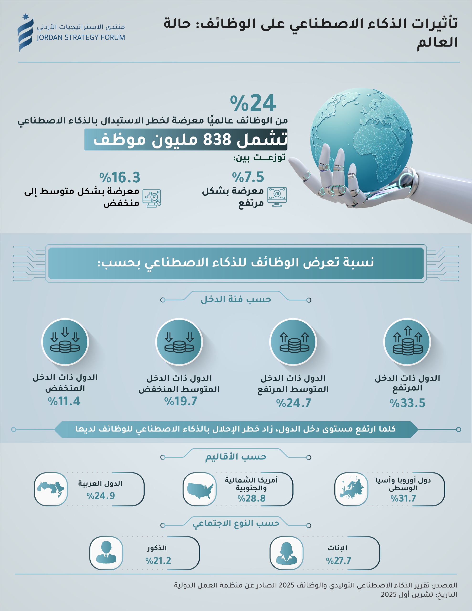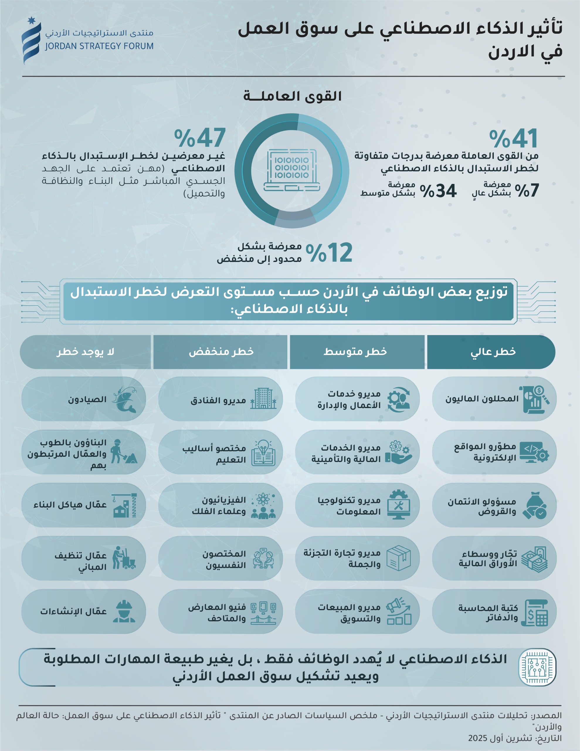 أصدر منتدى الاستراتيجيات الأردني ملخص سياسات بعنوان "تأثير الذكاء الاصطناعي على سوق العمل: حالة العالم والأردن" وذلك لتسليط الضوء على أبرز نتائج تقرير "الذكاء الاصطناعي التوليدي والوظائف: مؤشر عالمي محسّن للتعرّض المهني 2025" الصادر عن منظمة العمل الدولية. كما حدد المنتدى في ورقته أثر الذكاء الاصطناعي على سوق العمل الأردني، علاوة على تقديمه لبعض التوصيات العملية من أجل الحد من تداعياته المحتملة، وكيفية تعزيز قدرة سوق العمل على التكيف مع التحولات التكنولوجية المستقبلية.