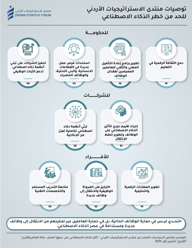 وأوصى منتدى الاستراتيجيات الأردني بضرورة العمل على استشراف مدى تأثير الذكاء الاصطناعي على سوق العمل الأردني، وكيفية حماية العاملين فيه، واستدامة وظائفهم، وذلك بالاستثمار في التعليم، وإعادة التأهيل المهني، من خلال اعتبار الثقافة الرقمية هي النهج الأساسي في التعليم، وتوفير برامج متخصصة لإعادة التأهيل المهني والتقني، وتعزيز التعاون بين الجامعات والصناعة.
