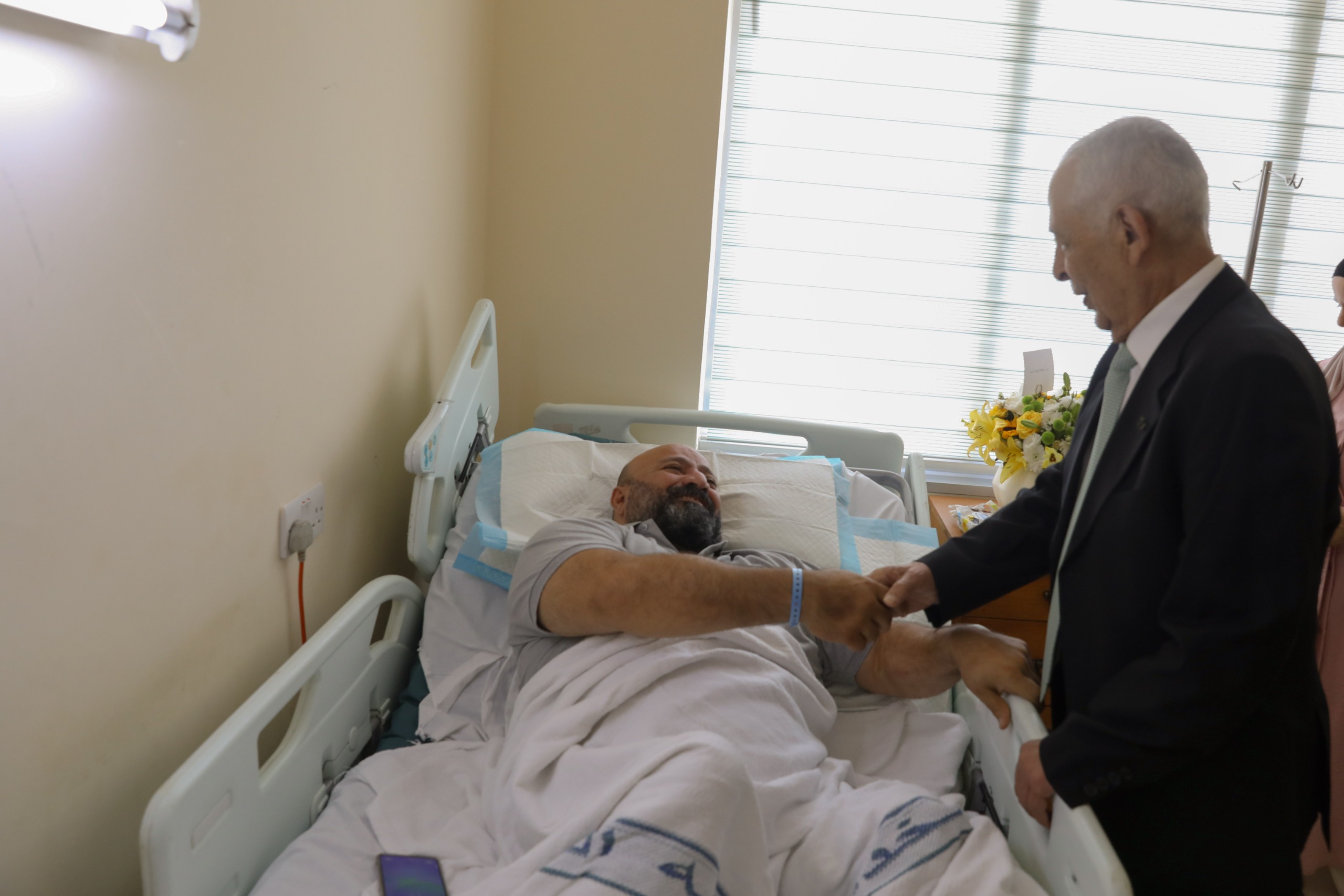 تنفيذاً للتوجيهات الملكية السامية، اطمأن رئيس الديوان الملكي الهاشمي يوسف حسن العيسوي، اليوم الاثنين، على الحالة الصحية للبطل البارالمبي العالمي الكابتن معتز الجنيدي، بطل العالم في رفع الاثقال، الذي يرقد على سرير الشفاء في المدينة الطبية إثر تعرضه لكسر في مفصل الحوض خلال معسكر تدريبي في مملكة البحرين، ضمن استعداداته للمشاركة في بطولة العالم لرفع الأثقال.
