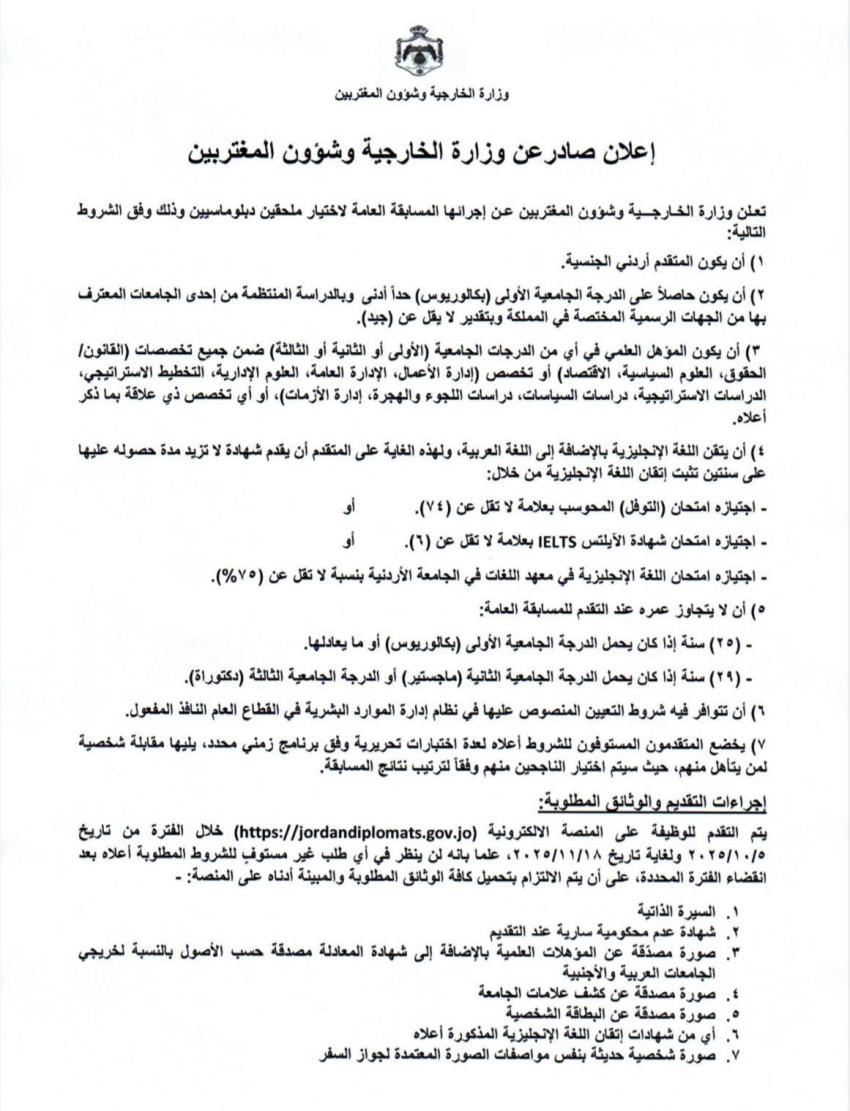 الأنباط - أعلنت وزارة الخارجية وشؤون المغتربين اليوم السبت، عن إجراء مسابقة لاختيار ملحقين دبلوماسيين وضمهم لكادرها.