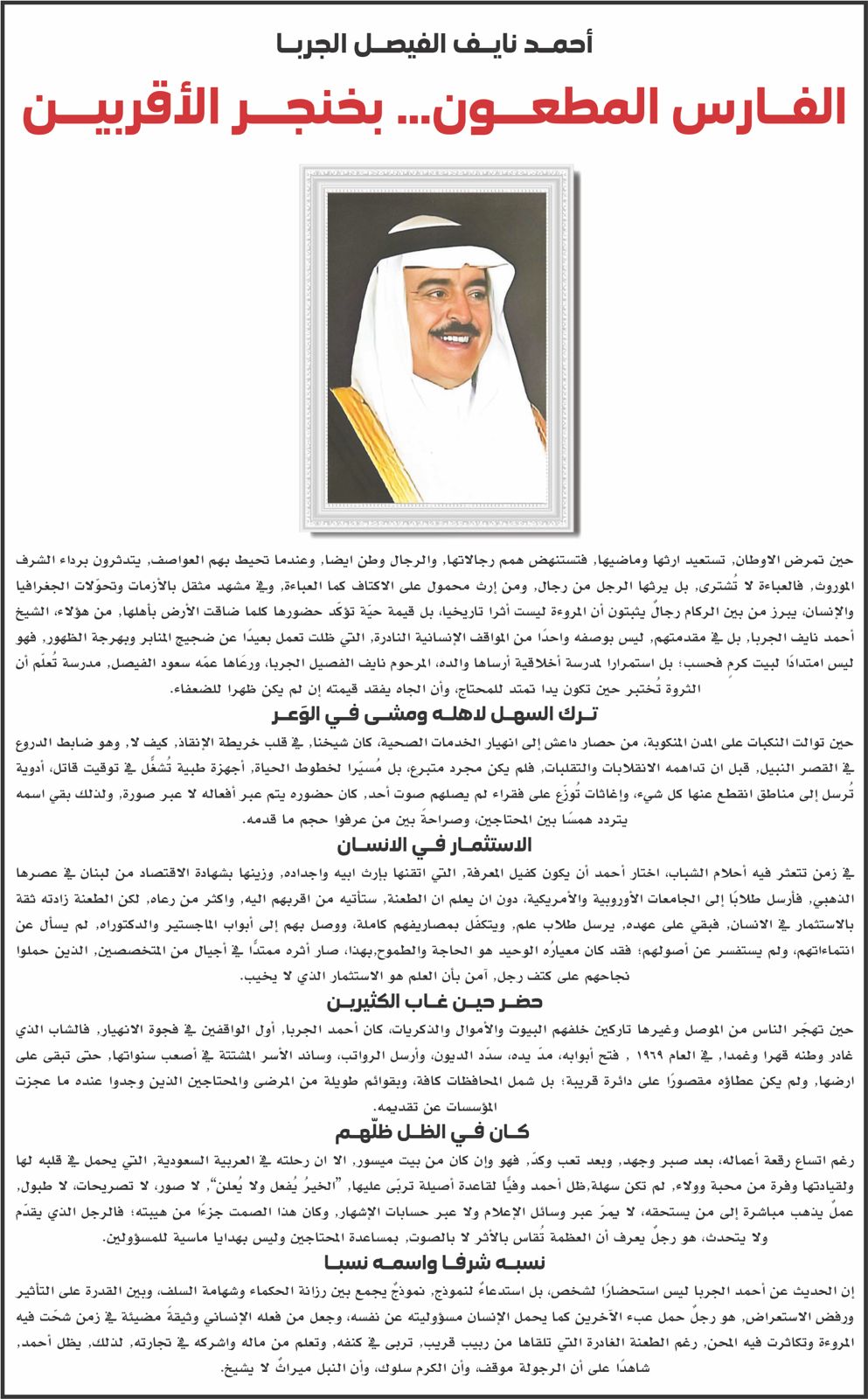 إن الحديث عن أحمد الجربا ليس استحضارًا لشخص، بل استدعاءٌ لنموذج, نموذجٌ يجمع بين رزانة الحكماء وشهامة السلف، وبين القدرة على التأثير ورفض الاستعراض, هو رجلٌ حمل عبء الآخرين كما يحمل الإنسان مسؤوليته عن نفسه، وجعل من فعله الإنساني وثيقةً مضيئة في زمن شحّت فيه المروءة وتكاثرت فيه المحن, رغم الطعنة الغادرة التي تلقاها من ربيب قريب, تربى في كنفه, وتعلم من ماله واشركه في تجارته, لذلك, يظل أحمد, شاهدًا على أن الرجولة موقف، وأن الكرم سلوك، وأن النبل ميراثٌ لا يشيخ.
