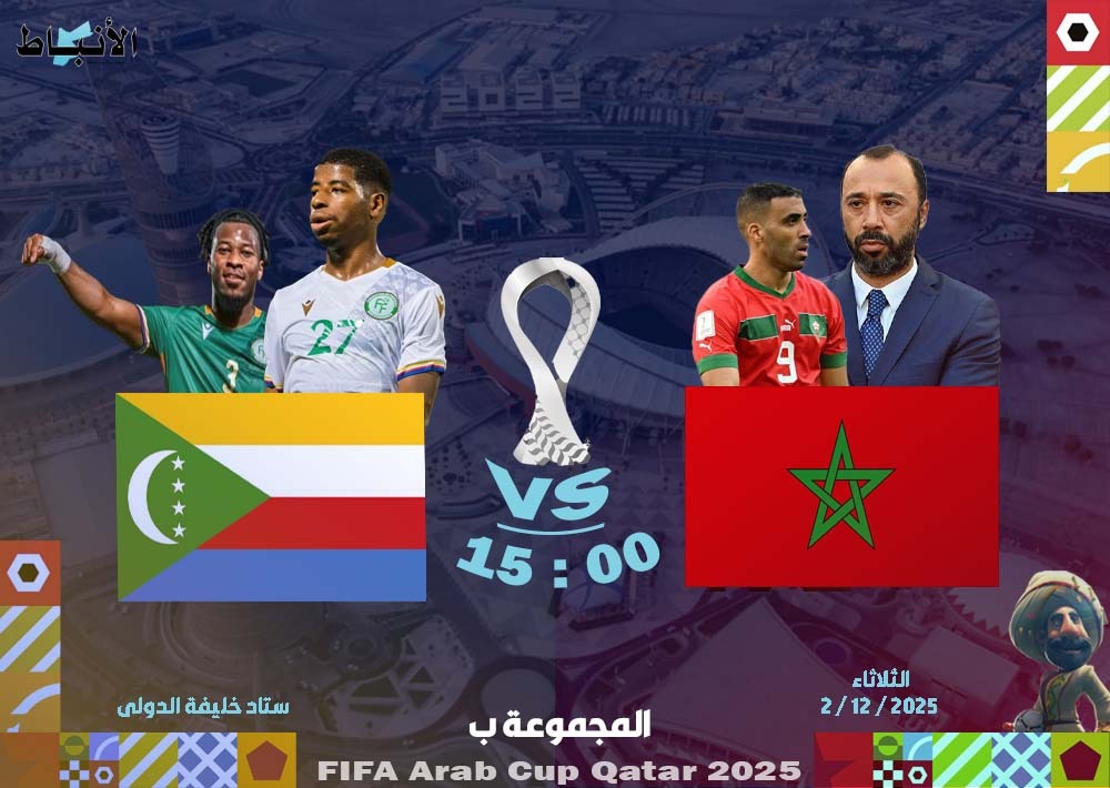 تتجه الأنظار اليوم إلى ملعب خليفة الدولي في الدوحة حيث يفتتح المنتخبان المغربي والقمري مواجهات المجموعة الثانية من كأس العرب 2025، في مباراة تُعد من أكثر لقاءات الجولة الأولى ترقّباً ليس فقط لأنها تجمع منتخبا مرشحا للقب وإنما لأنها تضعه أمام خصم يدخل البطولة لـ أول مرة بـ طموح المفاجأة، انطلاقة المجموعة الثانية تحمل طابعا خاصاً لان المغرب يدخل بثقله الفني رغم بعض الغيابات وجزر القمر يدخل بروح (الفريق الذي لا يملك ما يخسره) ، ما يمنح المواجهة بعداً تنافسياً أكبر من المتوقع .