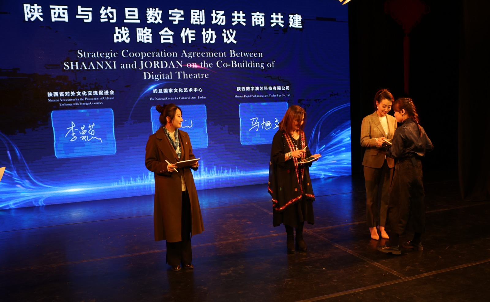 وخلال حفل الافتتاح، تم توقيع مذكرة تفاهم وتعاون في مجال المسرح الرقمي بين المركز الوطني الأردني للثقافة والفنون وجمعية مقاطعة شنشي الصينية لتعزيز التبادل الثقافي وشركة شنشي للفنون الرقمية تمهيدا لإطلاق تعاون أكثر في المستقبل.