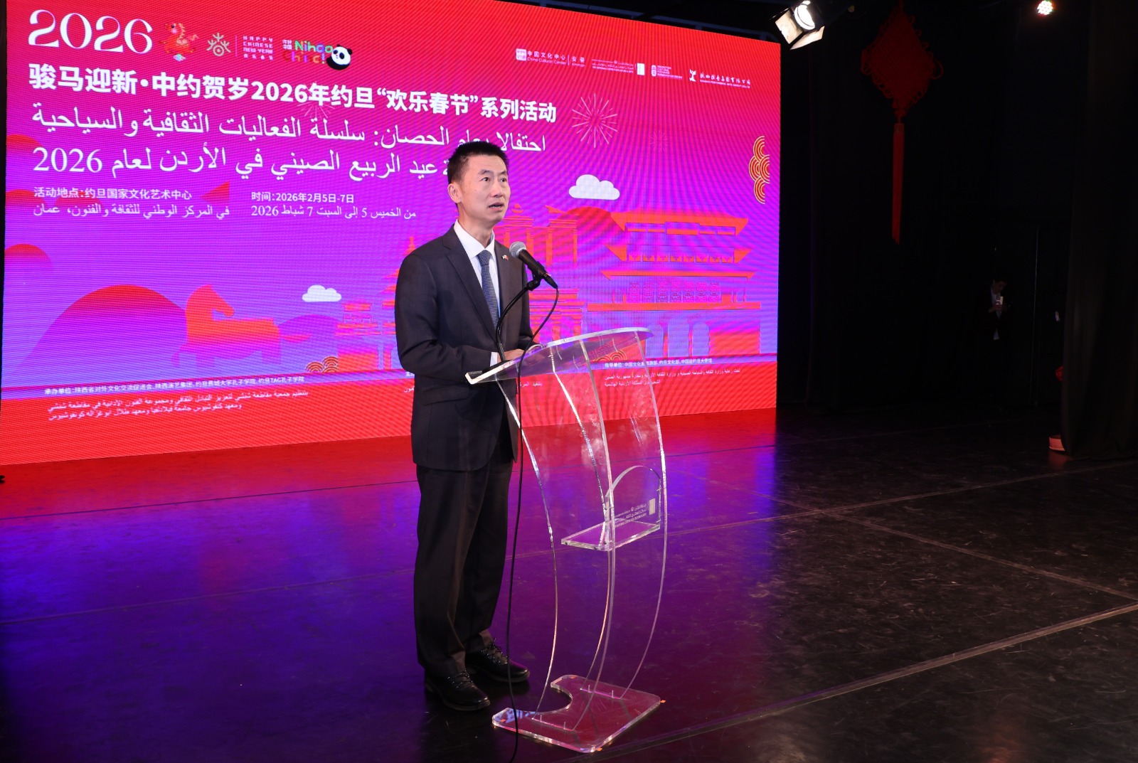وأكد أن الفعاليات بمناسبة عيد الربيع الصيني في الأردن أصبحت منصة مهمة لتعزيز التبادل والتقارب الثقافي بين الصين والأردن. كما أشار إلى أن عام 2026 هو عام الحصان وفق التقويم الصيني، وما يرمز إليه من إعجاب ثقافي مشترك بين الشعبين الصيني والعربي، تعكس روح الصداقة والتواصل الحضاري.