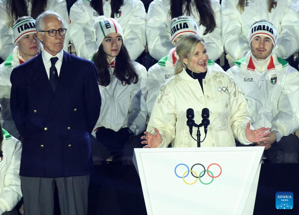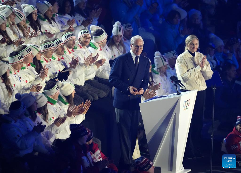 Giovanni Malago, president of the Milan-Cortina 2026 organizing committee, addresses the closing ceremony of the Milan-Cortina 2026 Olympic Winter Games at Verona Olympic Arena in Verona, Italy, Feb. 22, 2026. (Xinhua/Xue Yuge)