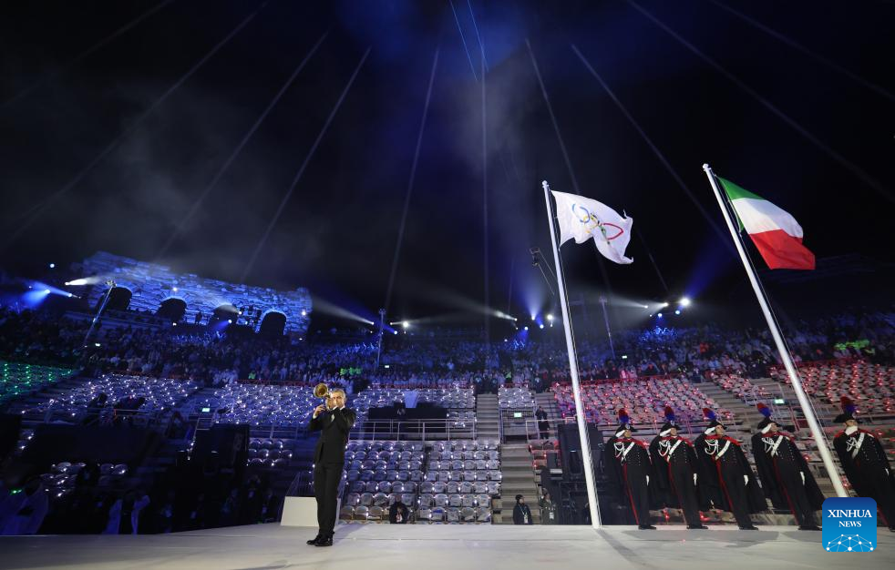 This photo taken on Feb. 22, 2026 shows the closing ceremony of the Milan-Cortina 2026 Olympic Winter Games at Verona Olympic Arena in Verona, Italy. (Xinhua/Li Ming)