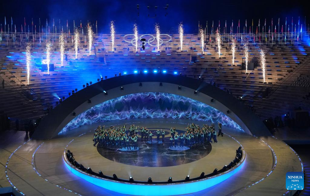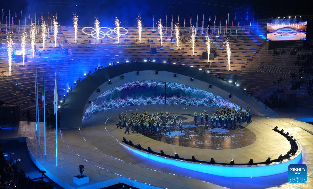 This photo taken on Feb. 22, 2026 shows the closing ceremony of the Milan-Cortina 2026 Olympic Winter Games at Verona Olympic Arena in Verona, Italy. (Xinhua/Xue Yuge)