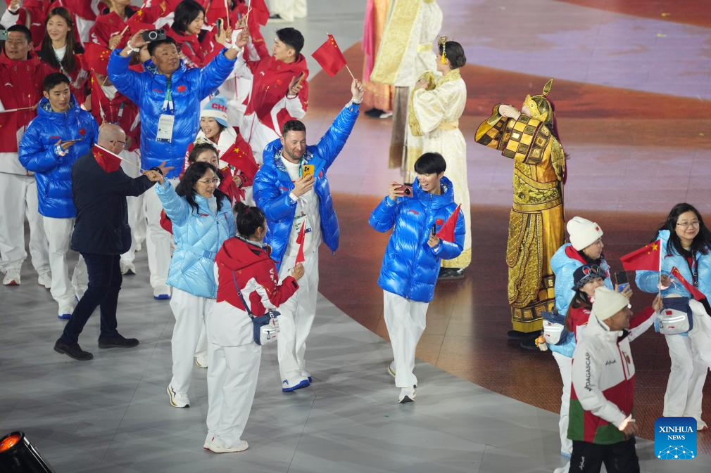 Members of the delegation of China parade during the closing ceremony of the Milan-Cortina 2026 Olympic Winter Games at Verona Olympic Arena in Verona, Italy, Feb. 22, 2026. (Xinhua/Li Jing)