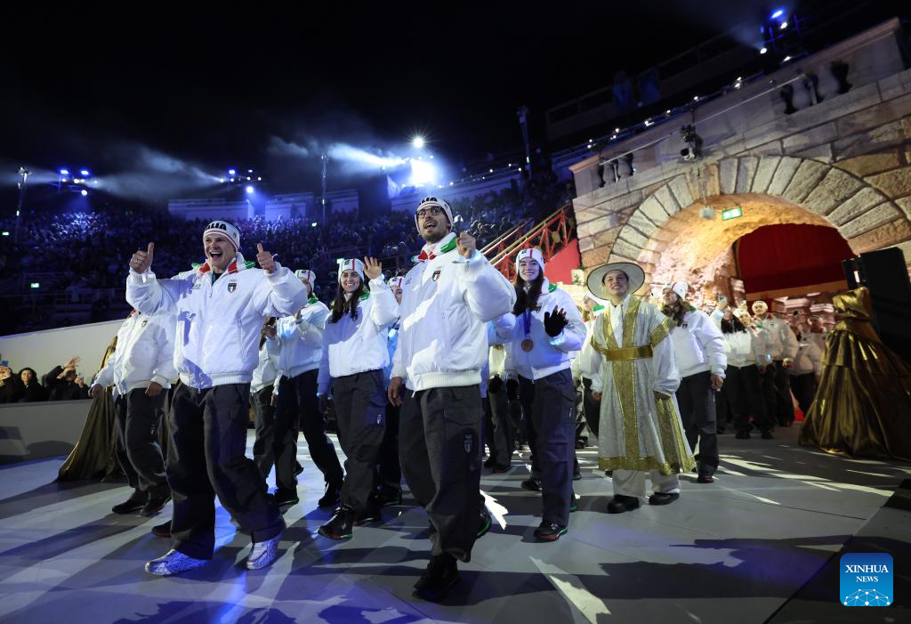 Athletes of Italy parade during the closing ceremony of the Milan-Cortina 2026 Olympic Winter Games at Verona Olympic Arena in Verona, Italy, Feb. 22, 2026. (Xinhua/Li Ming)