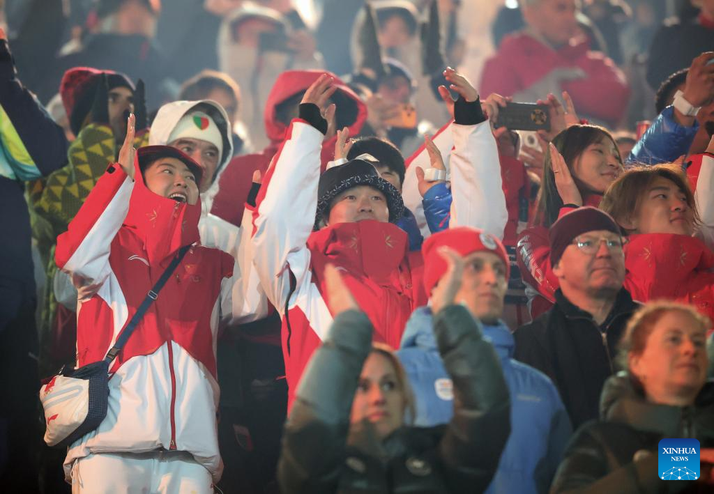 Members of the delegation of China attend the closing ceremony of the Milan-Cortina 2026 Olympic Winter Games at Verona Olympic Arena in Verona, Italy, Feb. 22, 2026. (Xinhua/Li Ming)
