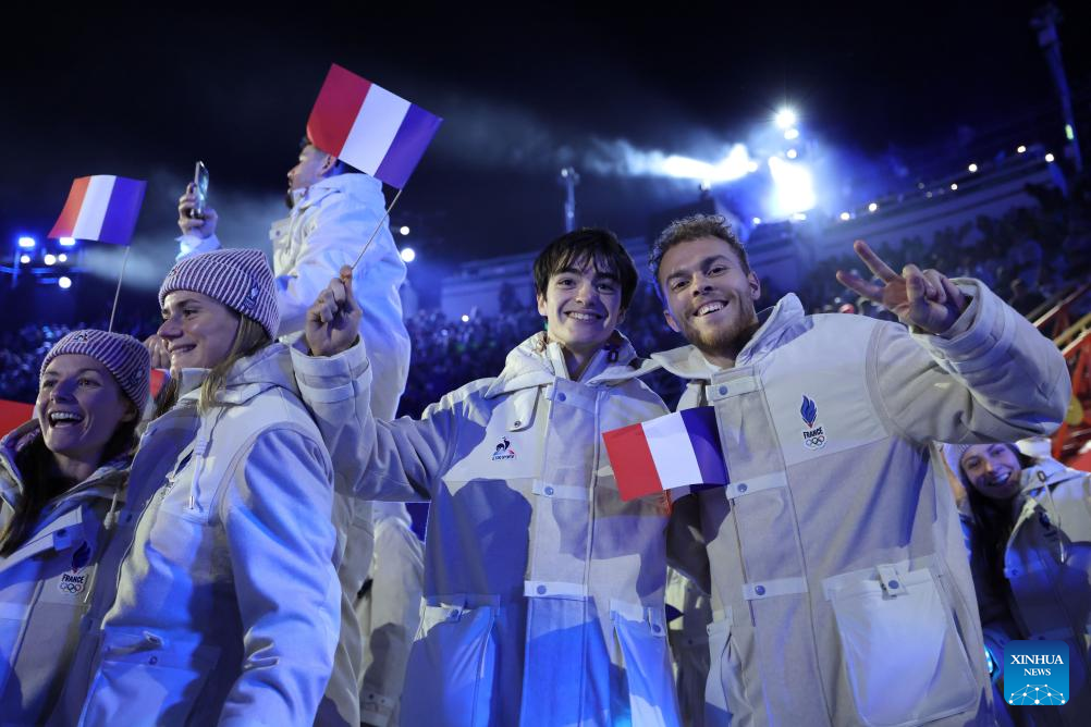 Athletes of France parade during the closing ceremony of the Milan-Cortina 2026 Olympic Winter Games at Verona Olympic Arena in Verona, Italy, Feb. 22, 2026. (Xinhua/Li Ming)