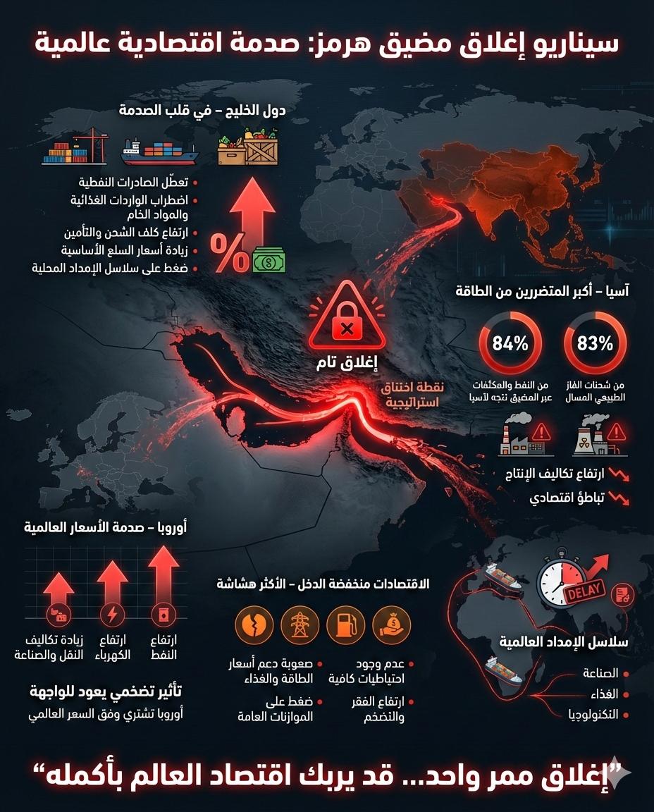 إغلاق مضيق هرمز لا يعني فقط توقف ناقلات نفط وإنما سلسلة ارتدادات اقتصادية تمتد من الخليج إلى آسيا وأوروبا وصولا إلى الاقتصادات الهشة أولها الدول الخليجية التي ستكون في قلب الصدمة ليس فقط بسبب تعطّل الصادرات النفطية بل أيضا نتيجة اضطراب الواردات الأساسية، فمعظم السلع الغذائية والمواد الخام تصل بحرا، وأي إغلاق يعني ارتفاع كلف الشحن والتأمين وزيادة مصاريف تشغيل الموانئ وتمويل المخزون الاستراتيجي، كما قد ترتفع أسعار الواردات الغذائية الأساسية ما يخلق ضغطا مباشرا على سلاسل الإمداد المحلية والأسعار في الأسواق.