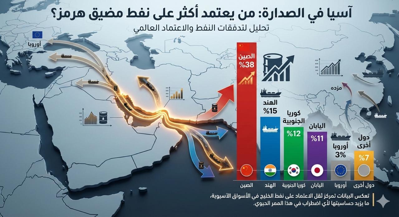 تُظهر بيانات تجارة الطاقة العالمية أن الجزء الأكبر من النفط العابر عبر مضيق هرمز يتجه نحو آسيا، ما يجعل اقتصاداتها الأكثر تأثرا بأي اضطراب محتمل وتأتي الصين في المرتبة الأولى إذ تستحوذ على نحو 38% من تدفقات النفط المارة عبر المضيق، تليها الهند بنسبة تقارب 15%، ثم كوريا الجنوبية بنحو 12% واليابان بنسبة تقارب 11%، أما أوروبا فتستقبل نحو 3% فقط من هذه التدفقات بشكل مباشر، فيما تتوزع النسبة المتبقية – وتقدّر بنحو 7% – على دول أخرى في آسيا ومناطق مختلفة هذه الأرقام تعكس تمركز ثقل الاعتماد على نفط الخليج في الأسواق الآسيوية بالدرجة الأولى ما يفسر حساسية تلك الاقتصادات لأي تصعيد في هذا الممر الحيوي.
