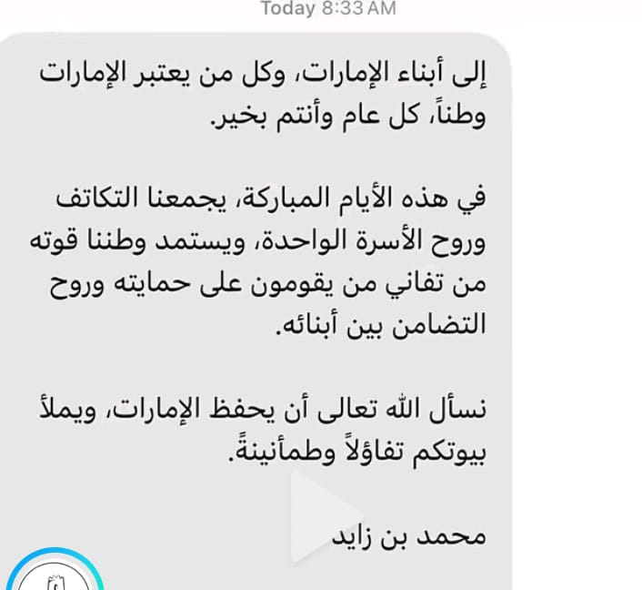 وجه رئيس دولة الإمارات العربية المتحدة سمو الشيخ محمد بن زايد آل نهيان بمناسبة عيد الفطر السعيد رسائل نصية لمواطني الدولة وجميع المقيمين على اراضيها و"وكل من يعتبر الإمارات وطناً" بحسب نص الرسالة