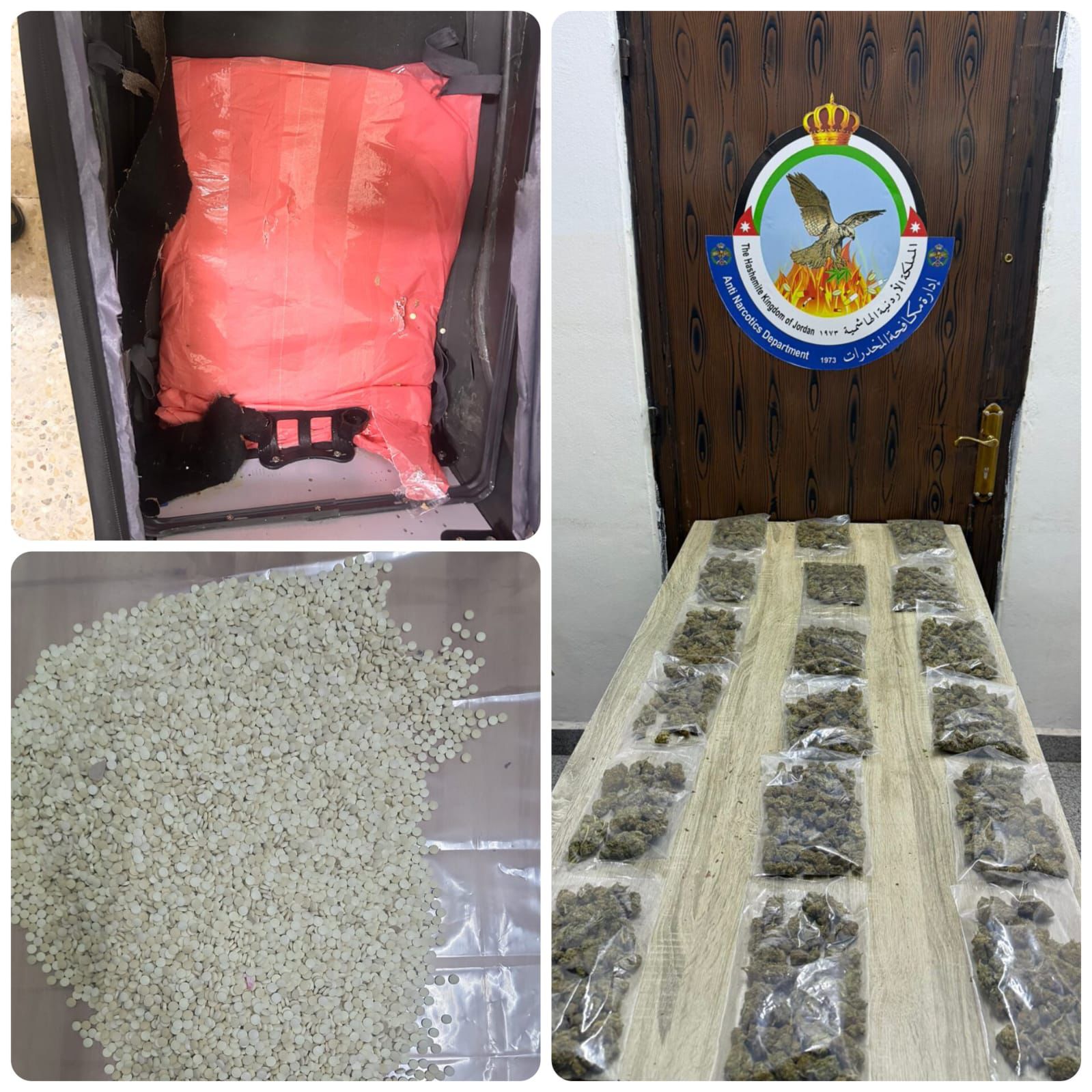 وفي محافظة المفرق وبعد مراقبة وجمع المعلومات عن أحد الأشخاص المشتبه بتورطه بالتعامل مع عصابات إقليمية لتهريب المخدرات والتأكد من نشاطاته الجرمية وحيازته للمواد المخدرة واستخدامه مزرعة في محافظة المفرق لتخزين وبيع تلك المواد، فقد جرت مداهمته وإلقاء القبض عليه وضُبط بحوزته 3 كيلو غرام من مادّة الكريستال المخدرة و 90 كف حشيش و 3000 آلاف حبّة مخدرة.