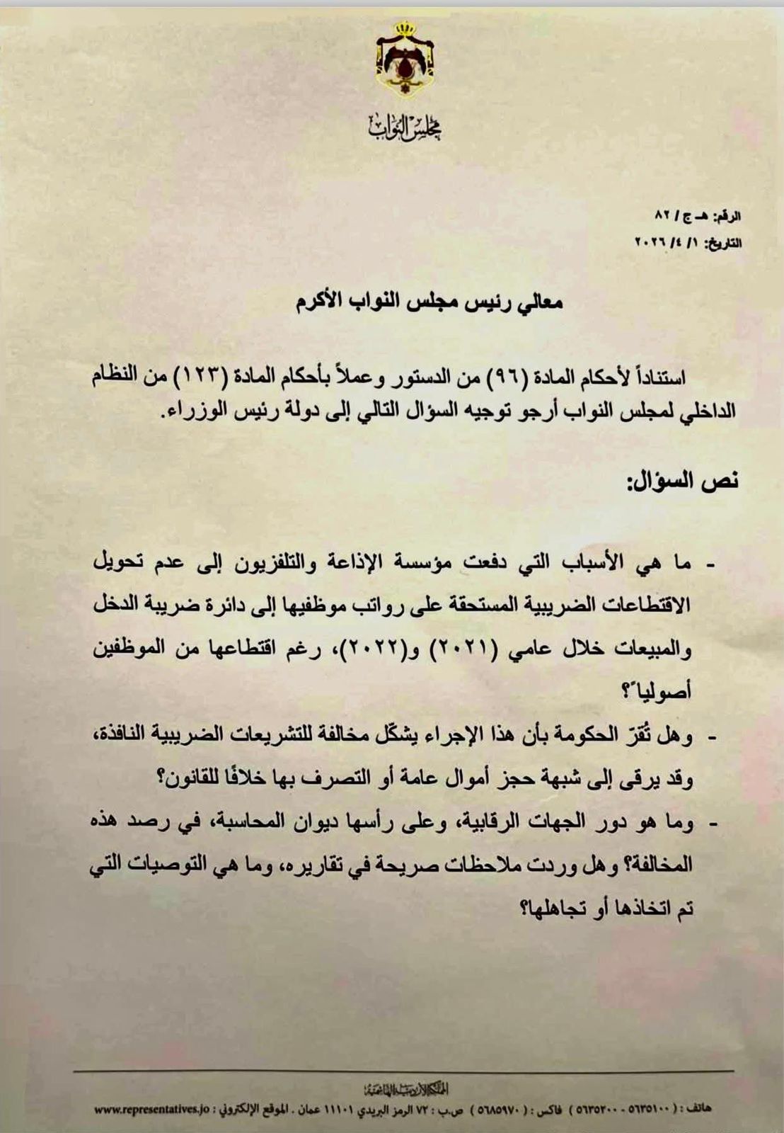 واستندت الجراح في سؤالها إلى أحكام المادة (96) من الدستور والمادة (123) من النظام الداخلي لمجلس النواب، مشيرة إلى أن هذه التجاوزات وقعت خلال عامي (2021) و(2022)، حيث تم اقتطاع المبالغ من الموظفين أصولياً دون توريدها للجهة المعنية.
