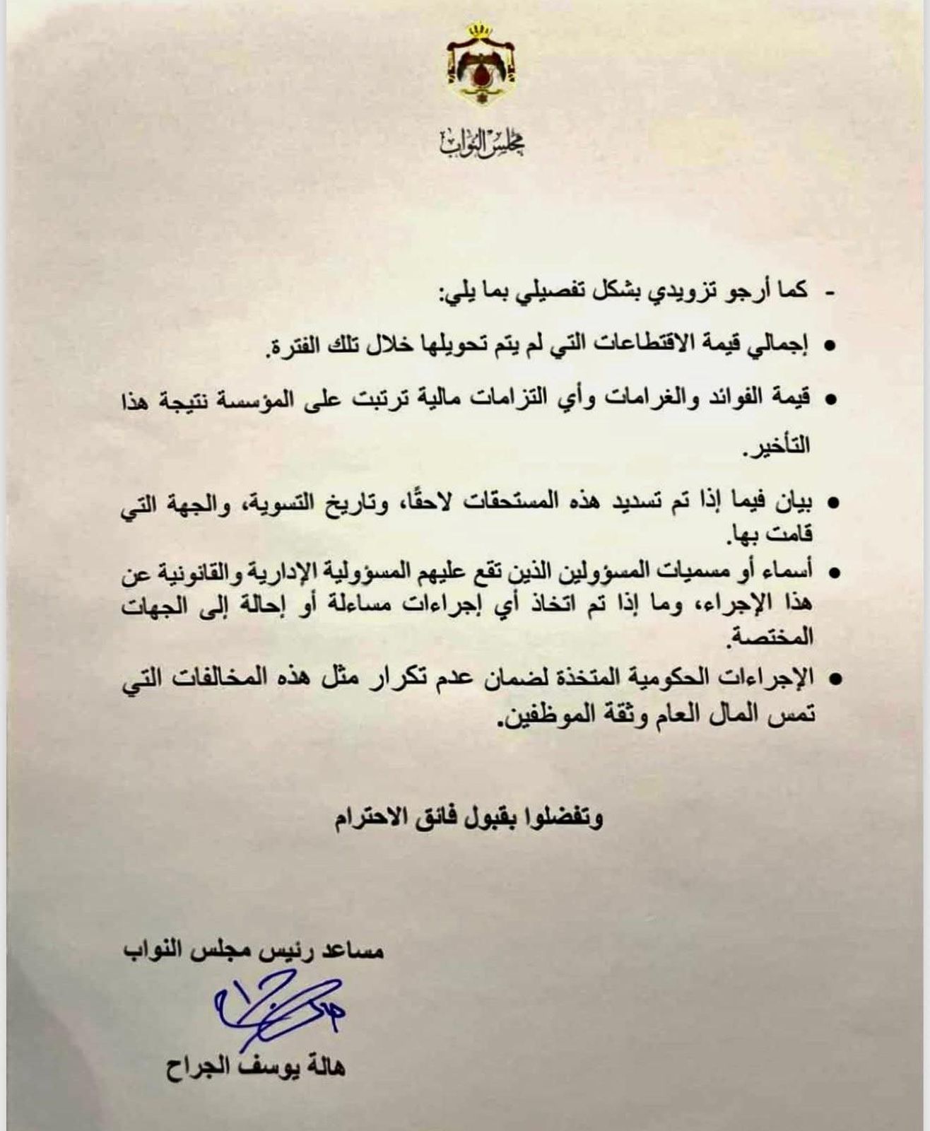 ولم يقتصر السؤال على الجانب المالي، بل طالبت الجراح بتحديد أسماء ومسميات المسؤولين الذين تقع عليهم المسؤولية الإدارية والقانونية عن هذا الإجراء، وما إذا كان قد تم اتخاذ أي إجراءات محاسبة أو إحالة إلى الجهات المختصة.