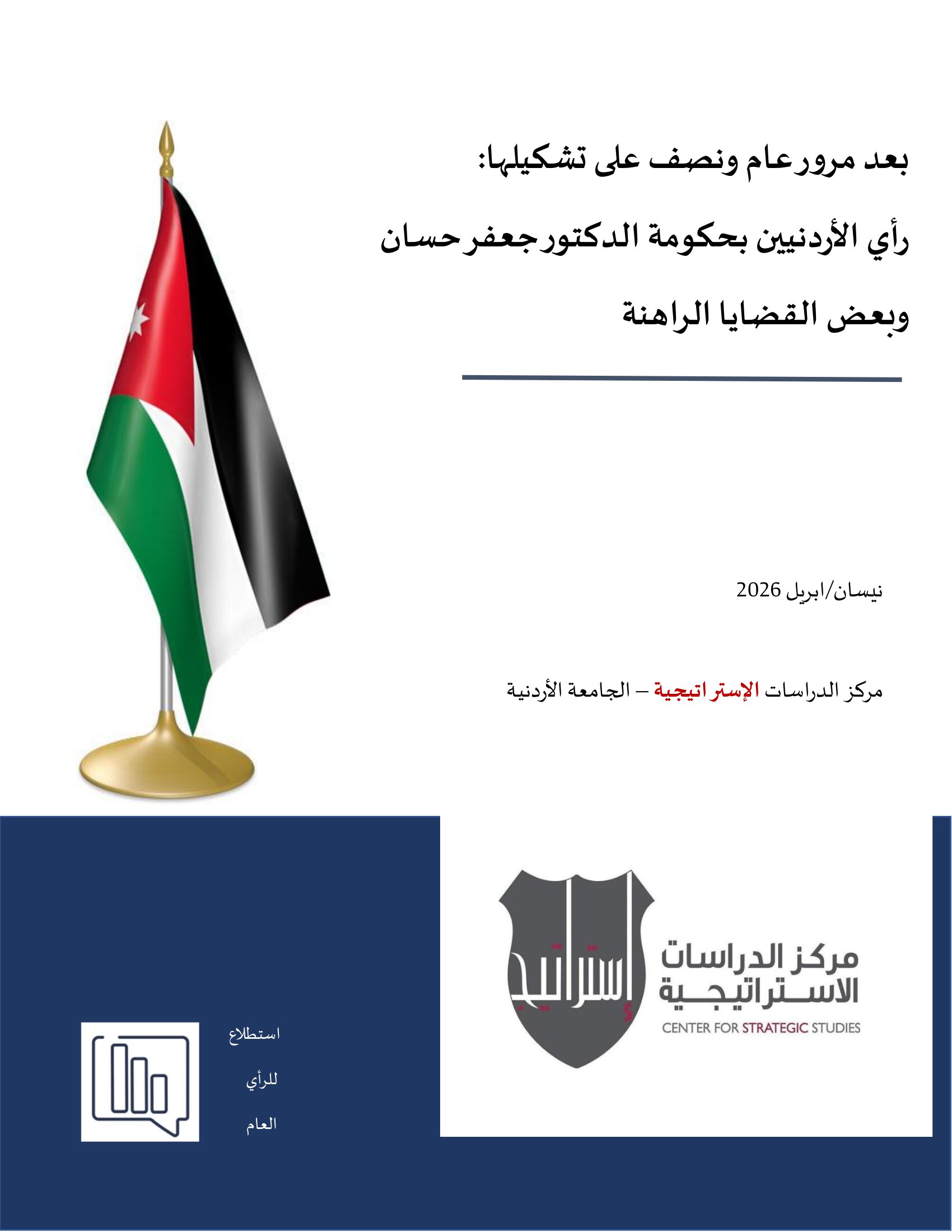 وأجرى المركز الاستطلاع خلال الفترة 24/3-4/4/2026 وبلغ حجم العينة الوطنية 1810 اشخص ممن تزيد أعمارهم عن 18 سنة مقارنة بحجم عينة 1200 مستجيب في الاستطلاعات السابقة، فيما اجري استطلاع التشكيل خلال الفترة بين 19-25/9/2024، واستطلاع الـ 100 يوم خلال الفترة 5-10/1/2025. وتم تنفيذ استطلاع 200 خلال الفترة 17-27/4/2025، واستطلاع مرور العام على تشكيل الحكومة خلال الفترة 21/9/-4/10/2025.