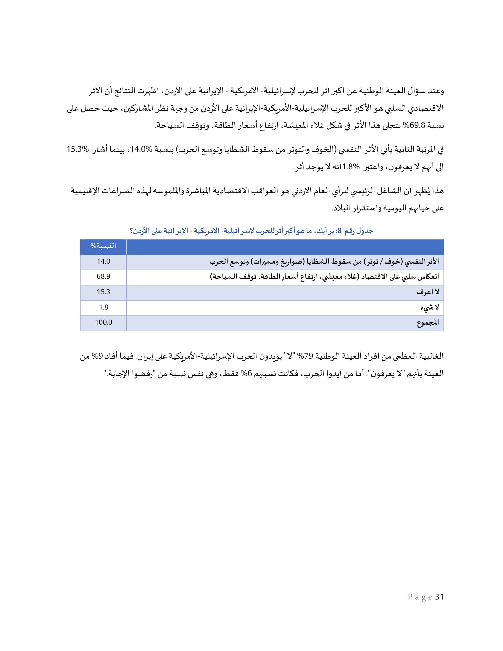 واظهرت النتائج أن الأثر الاقتصادي السلبي هو الأكبر للحرب الإسرائيلية-الأمريكية-الإيرانية على الأردن من وجهة نظر المشاركين، حيث حصل على نسبة 69.8% يتجلى هذا الأثر في شكل غلاء المعيشة، ارتفاع أسعار الطاقة، وتوقف السياحة. في المرتبة الثانية يأتي الأثر النفسي (الخوف والتوتر من سقوط الشظايا وتوسع الحرب) بنسبة 14.0%، بينما أشار 15.3% إلى أنهم لا يعرفون، واعتبر 1.8% أنه لا يوجد أثر.