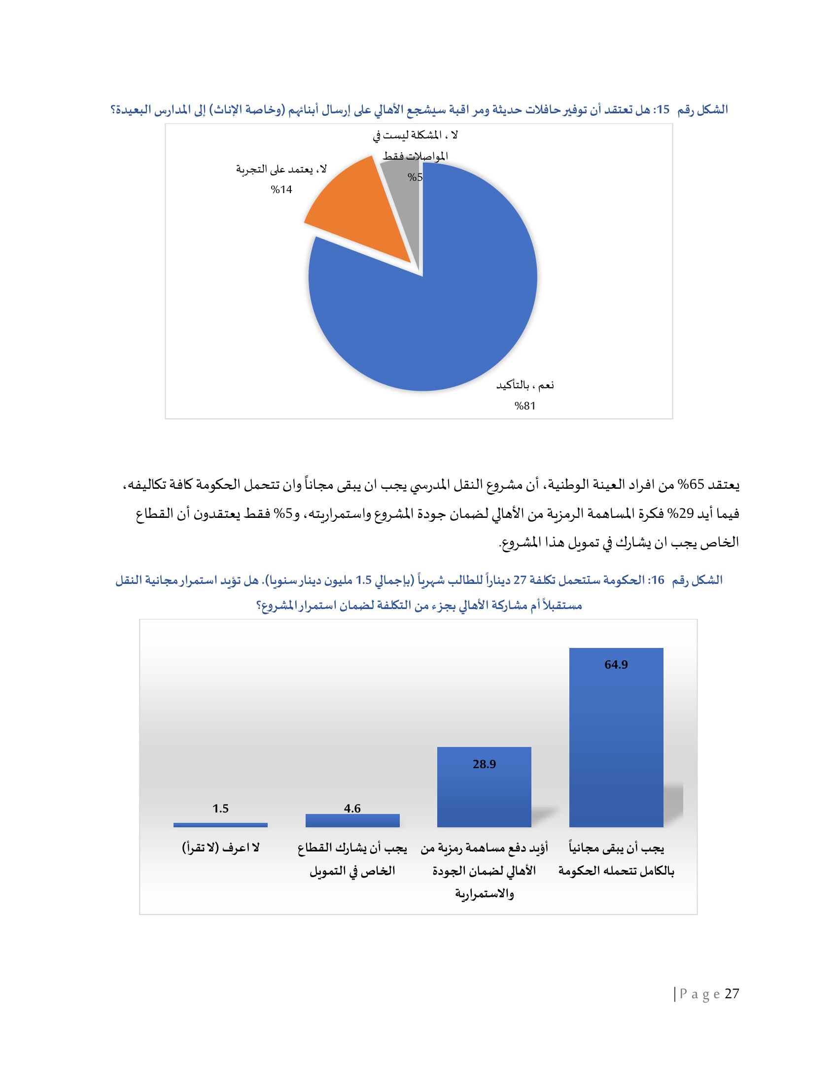ويعتقد 65% من افراد العينة الوطنية، أن مشروع النقل المدرسي يجب ان يبقى مجاناً وان تتحمل الحكومة كافة تكاليفه، فيما أيد 29% فكرة المساهمة الرمزية من الأهالي لضمان جودة المشروع واستمراريته، و5% فقط يعتقدون أن القطاع الخاص يجب ان يشارك في تمويل هذا المشروع.
