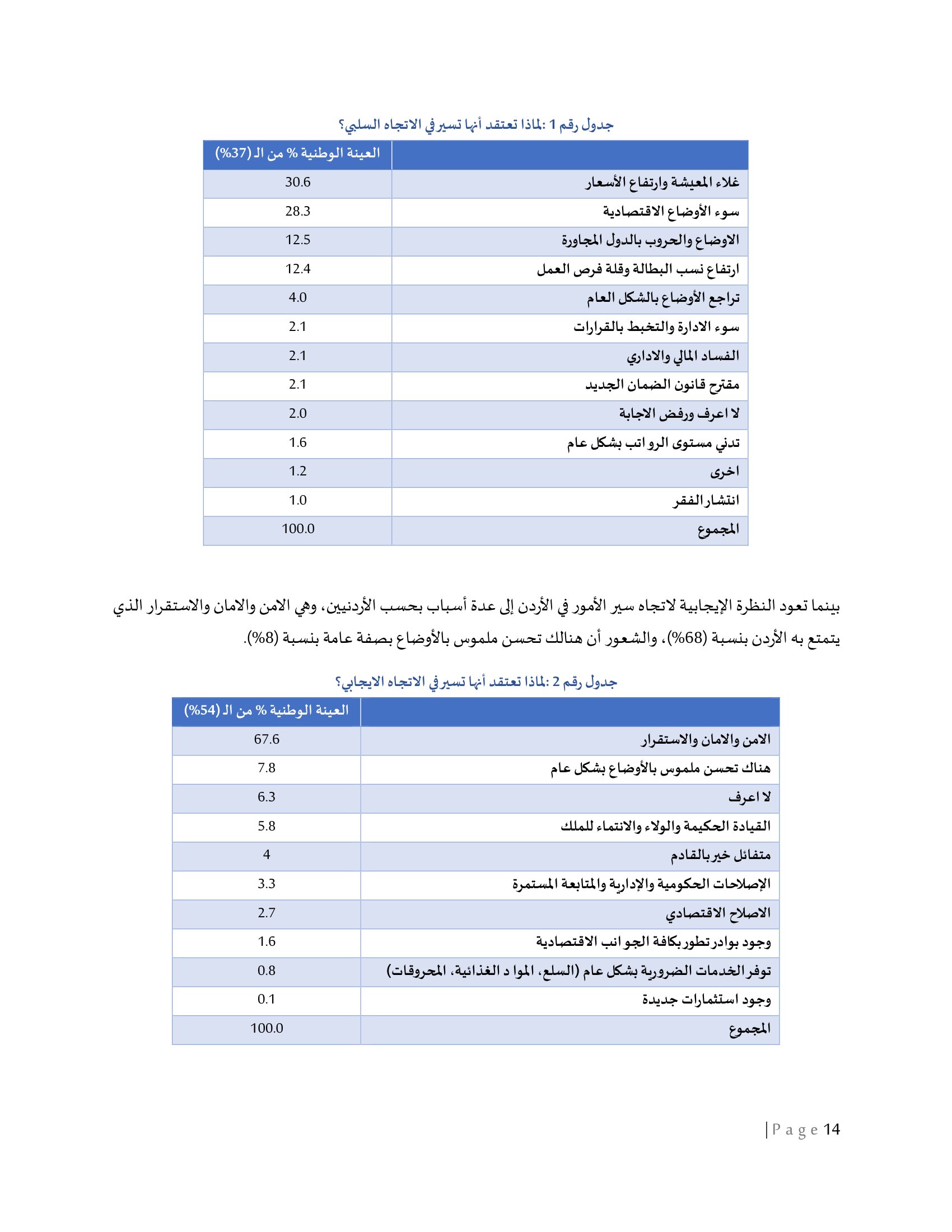 وتعود النظرة السلبية لاتجاه سير الأمور في الأردن إلى عدة أسباب بحسب الأردنيين، أبرزها سوء الاوضاع الاقتصادية (28.3%)، ارتفاع معدلات البطالة وقلة فرص العمل (12.4%)، وغلاء المعيشة وارتفاع الأسعار (30.6%)، والاوضاع والحروب بالدول المجاورة (12.5%)