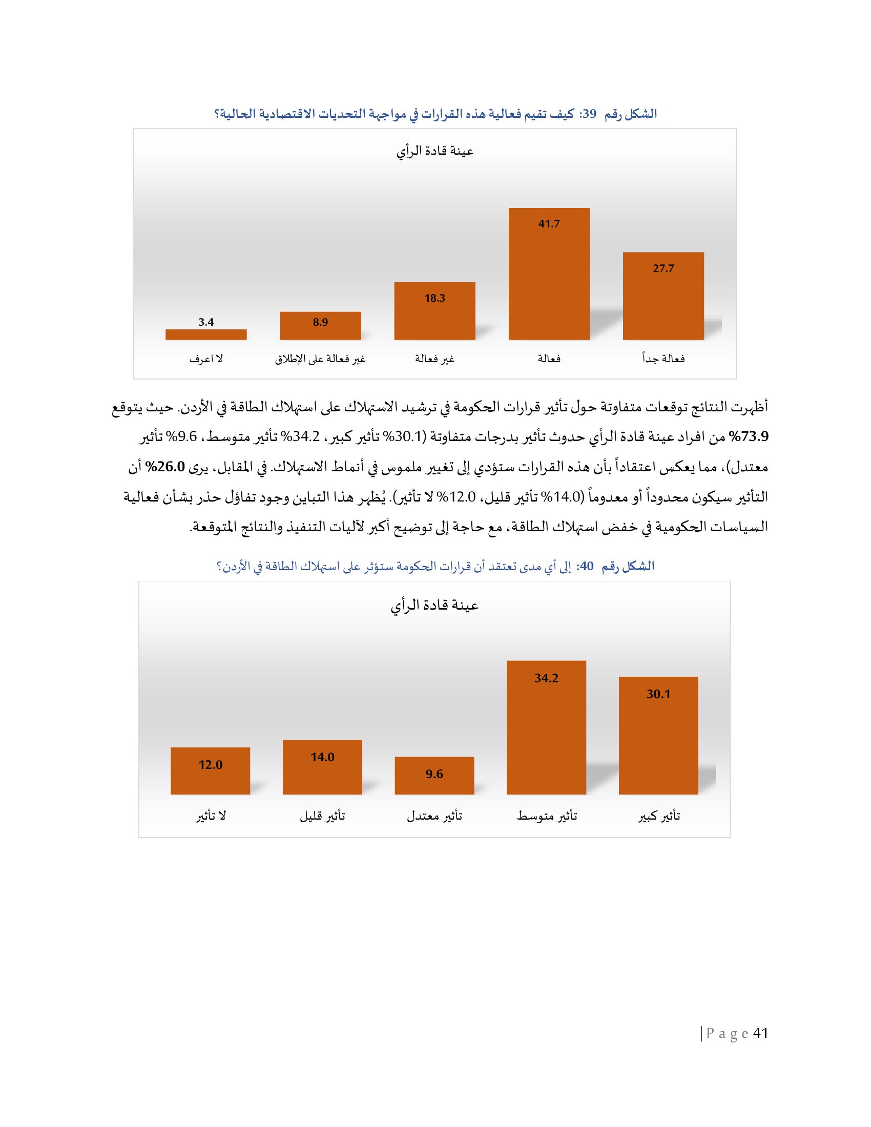 كما أظهرت النتائج توقعات متفاوتة حول تأثير قرارات الحكومة في ترشيد الاستهلاك على استهلاك الطاقة في الأردن. حيث يتوقع 73.9% من افراد عينة قادة الرأي حدوث تأثير بدرجات متفاوتة (30.1% تأثير كبير، 34.2% تأثير متوسط، 9.6% تأثير معتدل)، مما يعكس اعتقاداً بأن هذه القرارات ستؤدي إلى تغيير ملموس في أنماط الاستهلاك. في المقابل، يرى 26.0% أن التأثير سيكون محدوداً أو معدوماً (14.0% تأثير قليل، 12.0% لا تأثير).