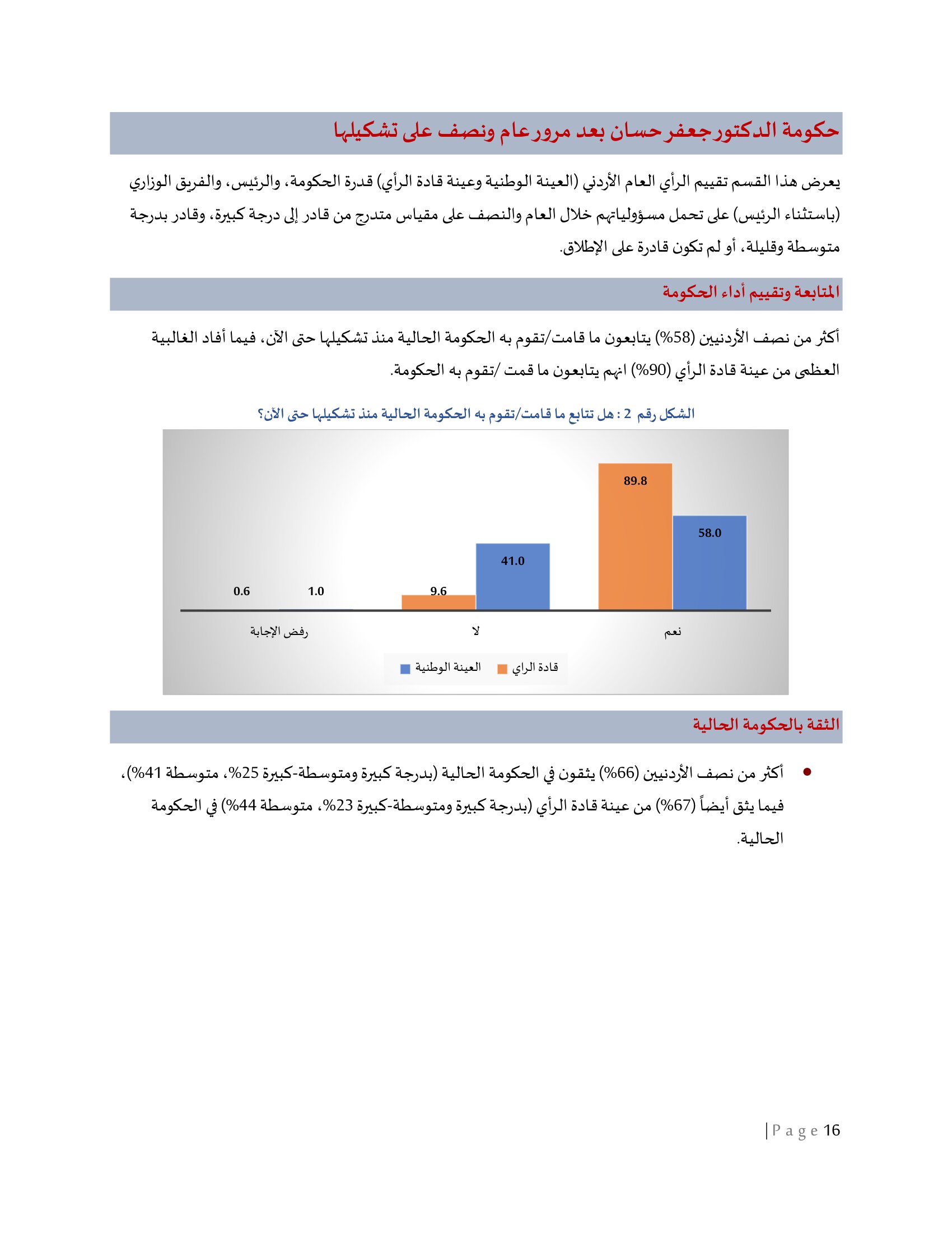 وأكثر من نصف الأردنيين (66%) يثقون في الحكومة الحالية (بدرجة كبيرة ومتوسطة-كبيرة 25%، متوسطة 41%)، فيما يثق أيضاً (67%) من عينة قادة الرأي (بدرجة كبيرة ومتوسطة-كبيرة 23%، متوسطة 44%) في الحكومة الحالية.